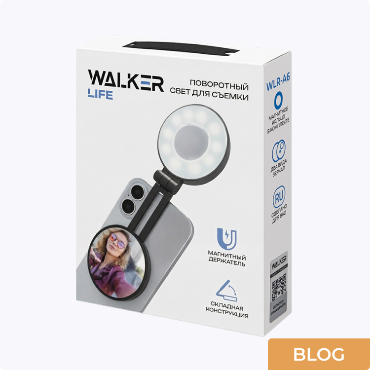 Поворотный свет для съёмки WALKER WLR-A6 — универсальный портативный свет для смартфона, который помогает получить качественное освещение в любых условиях. Кольцевая подсветка с регулировкой яркости и цветовой температуры (от холодного до тёплого) делает кожу более ровной, а кадр — профессиональным как при съёмке селфи, так и при работе основной камерой.